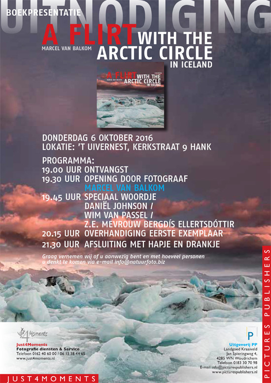 Op donderdag 6 Okober presenteer ik mijn nieuwe boek “A flirt with the arctic circle in Iceland”, een vierkant hardcover koffietafel boek in de Engelse taal. Het boek bevat foto’s die ik de laatste jaren in IJsland heb gemaakt. De foto’s worden ondersteund door gedichten, informatie en levenswijsheden. Het boek is gedrukt met als uitgangspunt een hoge kwaliteit op het gebied van scherpte en kleuren te garanderen, met extra drukgangen en speciale vernis lagen, om de foto’s optimaal te presenteren. Vanaf 6 oktober is het boek verkrijgbaar via de websites van picture publishers en natuurfoto.biz. Daarnaast zal het boek verkocht worden op ca. 15 plaatsen in IJsland (van Reykjavik, tot in het viking cafe bij de vestahorn). De prijs van het boek bedraagt 22.50 excl. verzendkosten.
